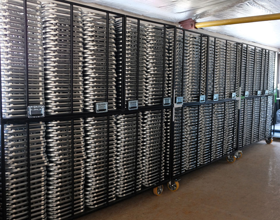 Židle jsou uskladněné ve třech různých velikostech transportních klecí v počtu od 140ks do 280ks.